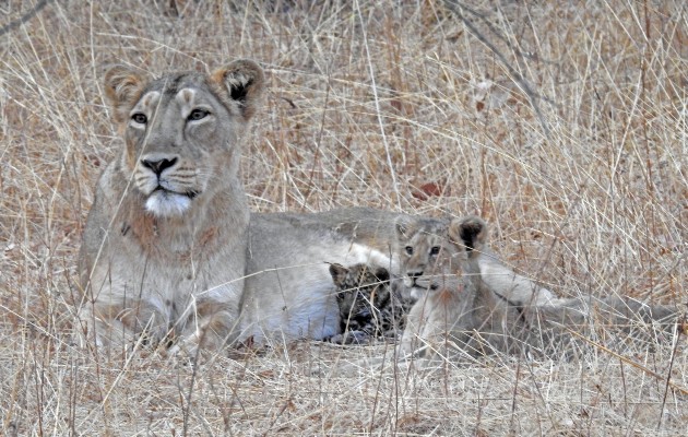 Una leona con su propio cachorro y uno de leopardo en el Parque Nacional Gir. Foto / Dheeraj Mittal.