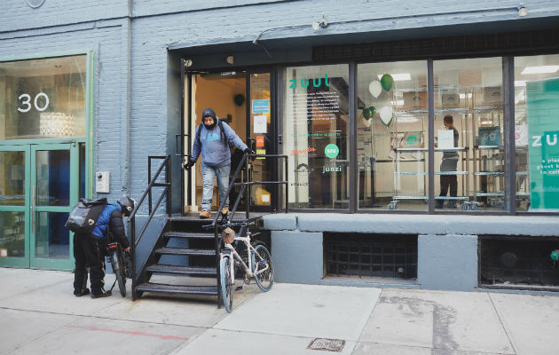 Encargados del reparto de comida entran y salen de un local en Manhattan que maneja seis restaurantes. Foto / Andrew White para The New York Times.