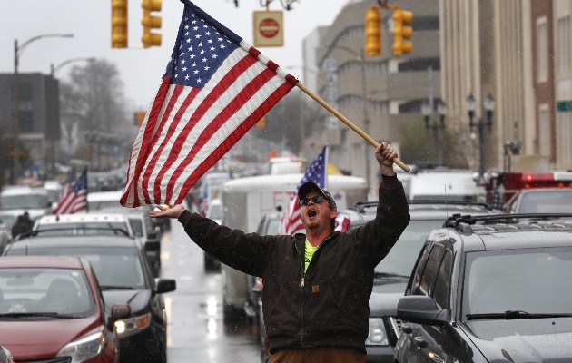 Un manifestante en Michigan entre una fila de autos pasando frente al Capitolio Estatal y tocando el claxon para protestar por los cierres. Foto / Paul Sancya/Associated Press.