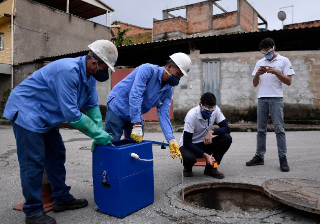 Científicos confían en que buscar el coronavirus en el drenaje ayude a predecir futuros brotes. Investigadores en Brasil recolectan muestras. Foto / Douglas Magno/Agence France-Presse — Getty Images.