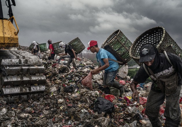 BEKASI, Indonesia — Incluso entre la fuerte lluvia, a medianoche, están afuera pepenando, portando lámparas frontales para revisar una montaña de basura que alcanza más de 15 pisos de altura.