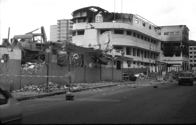 Vista del cuartel central de las Fuerzas de Defensa en Avenida A, El Chorrillo, luego del ataque del ejército norteamericano el 20 de diciembre de 1989. Foto: Archivo. Epasa.