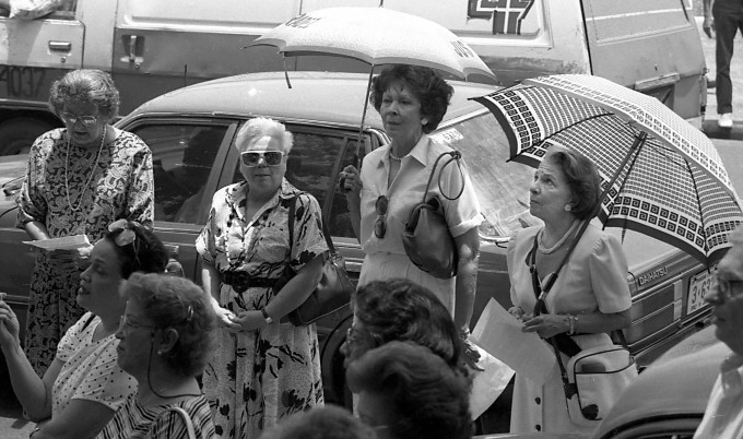 Doña Rosario, con paraguas de cuadritos, frente a la Procuraduría de la Nación,1985-1986, en una jornada de rezo del rosario, en la que se exigía la creación de una comisión investigadora del crimen de Hugo Spadafora. Foto: Cortesía: Alcídes Rodríguez.