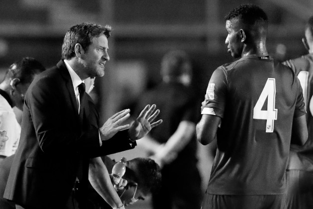 El entrenador de la Selección de Fútbol de Panamá, Thomas Christiansen, y el jugador Fidel Escobar, durante el partido Panamá-Costa Rica, en el Estadio Rommel Fernández, el 2 de septiembre. Foto: EFE.