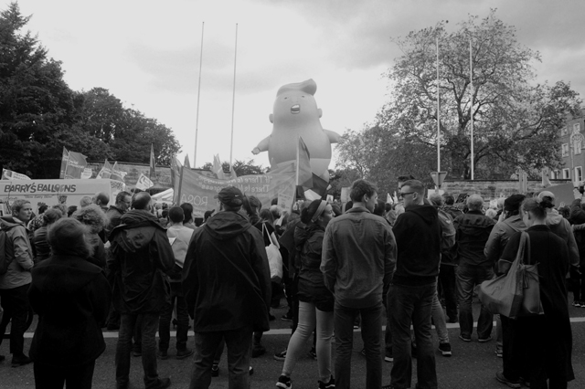 'Dumping Trump', la gran atracción de las protestas es un robot gigante, sentado sobre la taza del váter y tuiteando, que increpa a los manifestantes al grito de ¡"Fake News!". La concentración llevaba, también, el popular globo "Baby Trump", “made in China”, que el museo de Londres quiere exhibir.