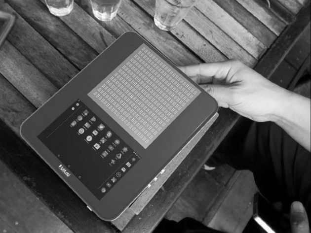 Blitab es una tableta con una pantalla táctil y una placa con ranuras que se activan para formar trece líneas de texto en braille, una revolucionaria combinación que permite a personas ciegas navegar por la red y traducir los contenidos. Foto: EFE.