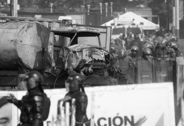 Uno de los camiones incendiados durante las protestas, durante este fin de semana, en el puente fronterizo entre Colombia y Venezuela, donde se trató de ingresar la ayuda humanitaria a la población necesitada. Foto EFE