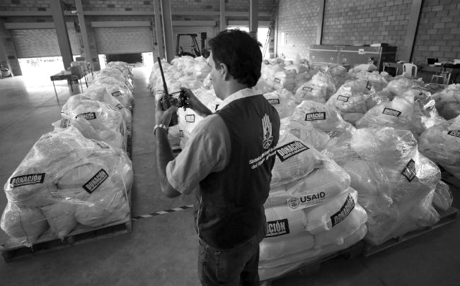 Un trabajador gubernamental hace un recuento de la ayuda humanitaria en una tienda en Cúcuta, Colombia, ciudad fronteriza con Venezuela. Foto AP.