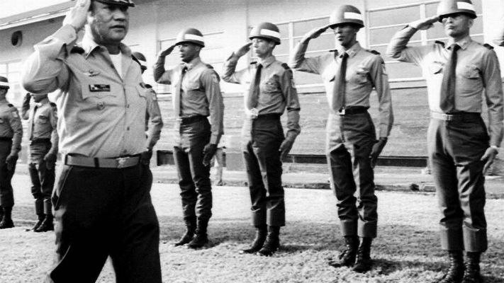 En foto de archivo, tomada en 1985, el general Manuel Antonio Noriega saluda a la tropa en un lugar no identificado. Foto: EFE.