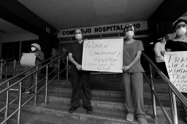Protesta de personal de salud. Las políticas públicas, sobre todo, la de salud, en momentos de contingencia ha sido manejada con cálculos económicos y no en aras de garantizar la salud plena. Foto: EFE.