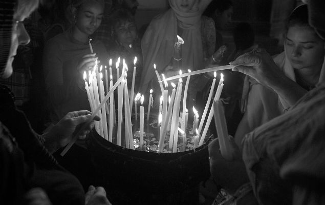 Fieles encienden velas en la considerada tumba de Jesucristo en la iglesia del Santo Sepulcro, en Jerusalén, Israel. Foto: EFE.