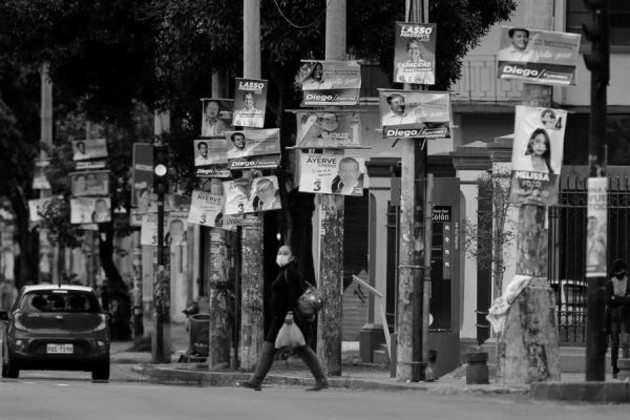 Carteles de los candidatos presidenciales en Ecuador. La cohabitación entre fuerzas republicanas, democráticas e institucionales, se debe formar en segunda vuelta para combatir el desgobierno, que representa el desacuerdo total de las fuerzas políticas vivas. Foto: EFE.