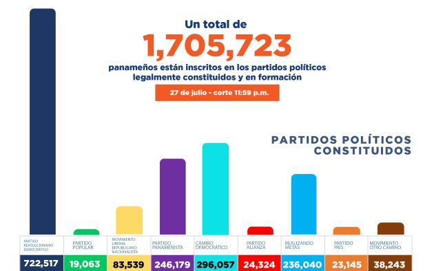 Hasta el jueves 27 de julio a las 11:59 p.m., un total de 1,705,723 panameños se encontraban inscritos en los distintos partidos políticos legalmente constituidos y en formación, de acuerdo con cifras de la Dirección Nacional de Organización Electoral (DNOE).