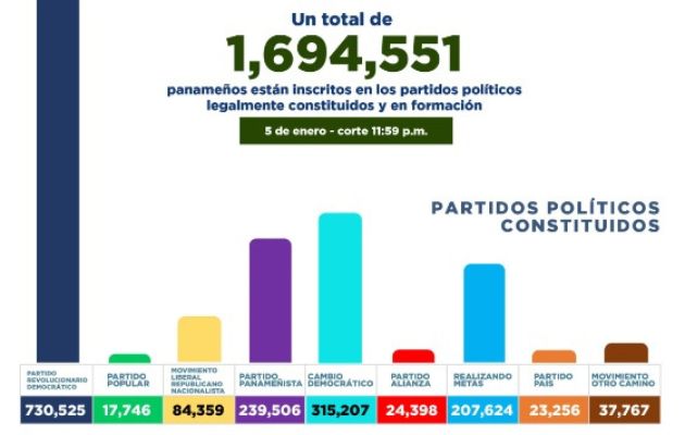 El Partido Revolucionario Democrático (PRD) totaliza 730,525 inscritos; Cambio Democrático (CD), 315,207; el Partido Panameñista, 239,506, Realizando Metas (RM), 207,624; el Movimiento Liberal Republicano Nacionalista (Molirena) 84,359.