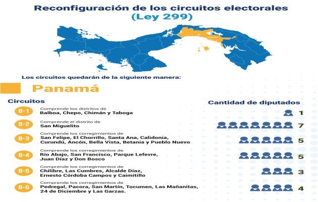 En el caso de la provincia de Panamá, el circuito 8-1 comprende los distritos de Balboa, Chepo, Chimán y Taboga, donde se elegirá a un diputado; el circuito 8-2 incluye el distrito de San Miguelito, donde se escogerá a siete diputados; el circuito 8-3 abarca los corregimientos de San Felipe, El Chorrillo, Santa Ana, Calidonia, Curundú, Ancón, Bella Vista, Betania y Pueblo Nuevo, donde se elegirá a cinco diputados.