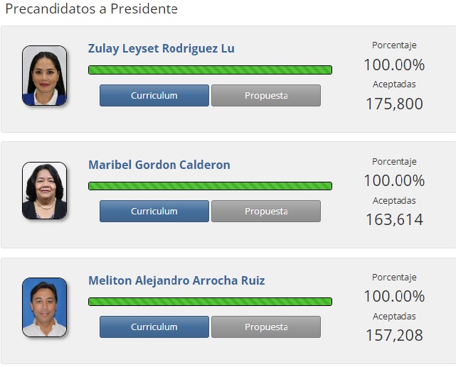 Los tres aspirantes a la Presidencia con más firmas recolectadas fueron Zulay Rodríguez (175,775), Maribel Gordón (163,563) y Melitón Arrocha (157,205), hasta las 11:00 a.m. de este domingo.