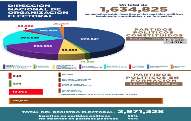 Según cifras de la Dirección Nacional de Organización Electoral, hasta la fecha 55% de panameños están inscritos en partidos políticos y 45% no pertenecen a ningún colectivo, lo que establece un total de 2, 971,328 ciudadanos en el registro electoral (Censo de 2010).