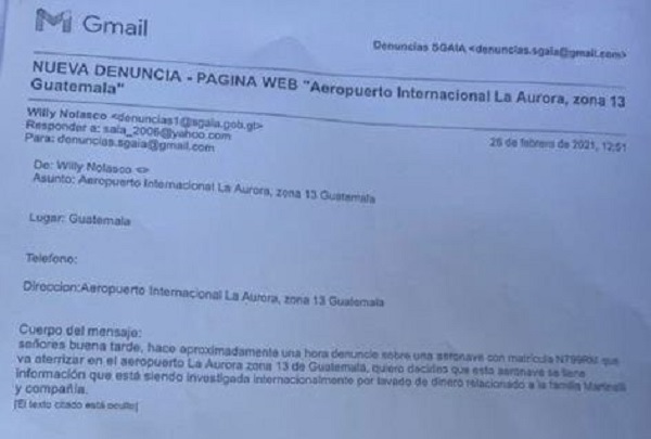 El informe destaca "derivado de una denuncia presentada a esta unidad la cual se identifica como denuncia N 289-2021 de fecha veintiséis de febrero de año de dos mil veintiuno, la cual ingresó a través del correo electrónico página web http://www.sgaia.gob.gt en donde se indica que la aeronave identificada con matrícula N799RM se obtuvo información a través de esa unidad del arribo de la aeronave antes descrita, la cual ingresaría al territorio nacional son conocer su procedencia".