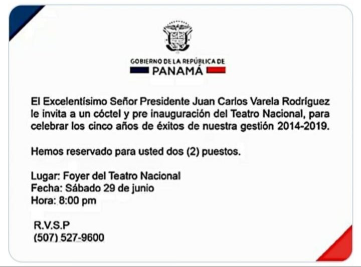 'El coctel de lujo que se realizará el próximo sábado 29 de junio en el Teatro Nacional es para celebrar los cinco años de éxitos de nuestra gestión 2015-2019', así lo expresa la invitación de la Presidencia de la República que circula en redes sociales.