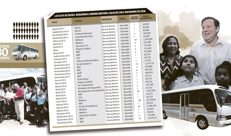 El primer informe abarca la mitad del gobierno de Varela, y el mismo revela que en ese periodo se habrían comprado 491 buses de 30 pasajeros, de los cuales 445 (92.8%) se adquirió a Bering Motors más de 21 millones de dólares, una filial del Grupo Machetazo de la familia Pool.