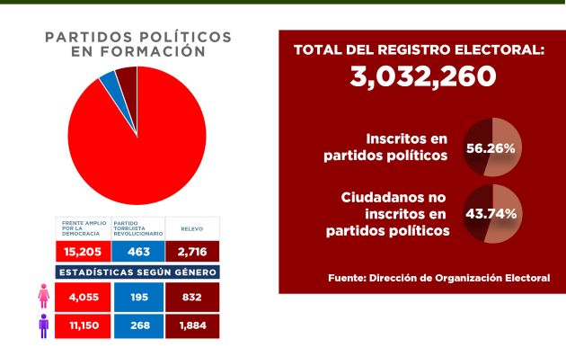 De los colectivos políticos en formación, el Frente Amplio por la Democracia (FAD) refleja 15,205 adherentes, la agrupación RELEVO posee 2,716 y el Partido Torrijista Revolucionario (PTR) registra 463.