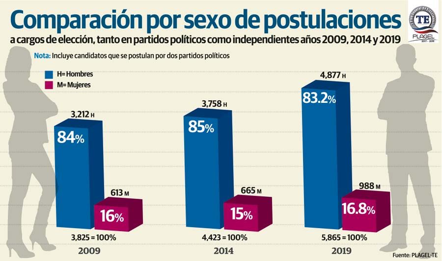 En el cuadro comparativo de las elecciones de este 2019, el 83.2% de los candidatos son hombres y el 16.8% mujeres.