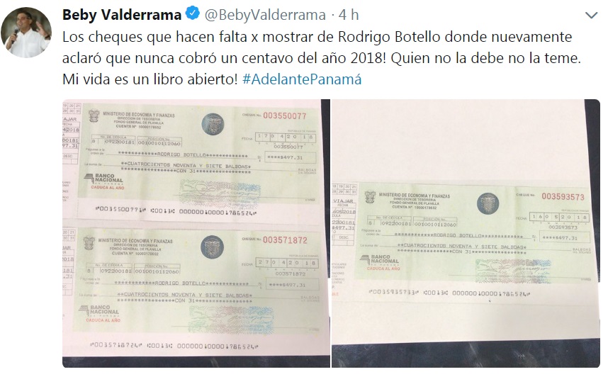 "Aquí copia de todos los cheques a nombre de Rodrigo Botello, él nunca cobró un centavo cuando decidió iniciar estudios en Mexico, todos estos cheques fueron entregados en la tesorería de la Asamblea Nacional", escribió Beby Valderrama.