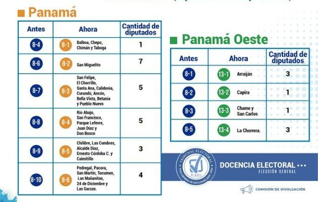 En el caso de Panamá, el circuito 8-1 (Balboa, Chepo, Chimán y Taboga) elige a un diputado; en el 8-2 de San Miguelito, se escogerá a siete diputados; en el circuito 8-3 (San Felipe, El Chorrillo, Santa Ana, Calidonia, Curundú, Ancón, Bella Vista, Betania y Pueblo Nuevo) se elegirá a cinco diputados.