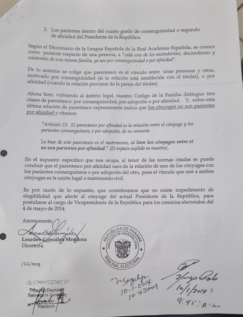 "Consideramos que no existe impedimento de elegibilidad que afecte al cónyuge del actual Presidente de la República para postularse al cargo de Vicepresidente de la República para los comicios electorales del 4 de mayo de 2014", señala la respuesta de Lourdes González Mendoza, directora de asesoría legal del Tribunal Electoral.