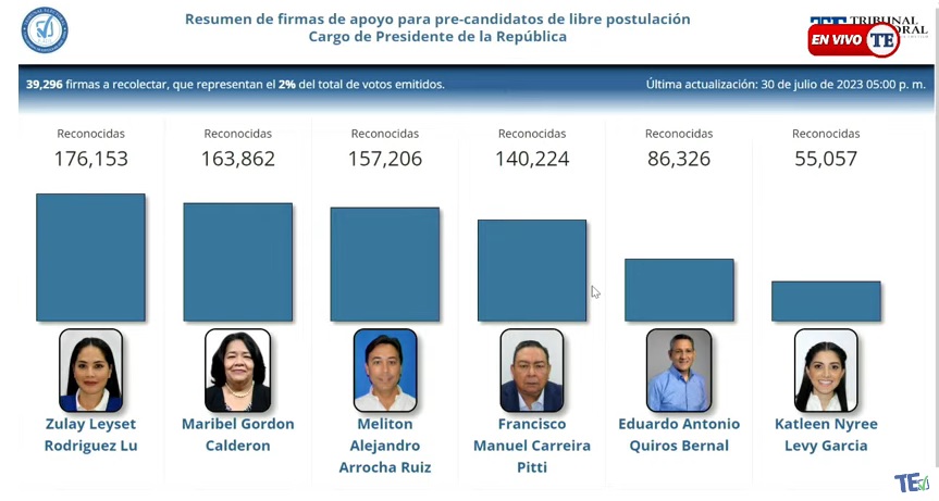 La recolección de firma para la candidatura por la libre postulación fue liderada por la diputada Zulay Rodríguez con 176,153 firmas, seguido de la profesora y economista Maribel Gordón con 163,862 firmas y en tercer lugar, el exministro panameñista Melitón Arrocha con 157, 206 firmas.