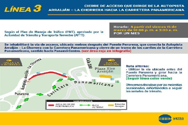 El Metro de Panamá anunció el cierre por un mes de un acceso de la Autopista Arraiján - La Chorrera hacia la carretera Panamericana, programado a partir de la fecha en horario de 10:00 p.m. a 3:00 a.m.