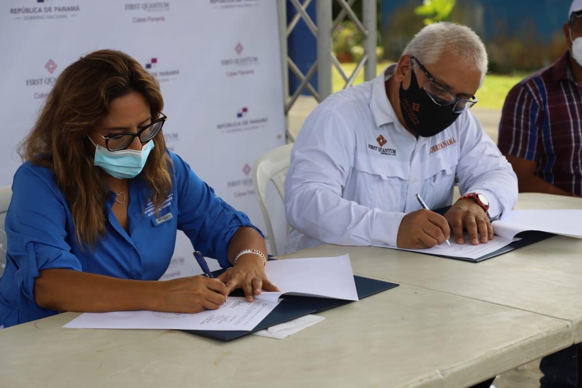 Flor Torrijos, administradora de la ARAP y Miguel Jaén, Superintendente de Asuntos Comunitarios de Minera Panamá, en la firma del acuerdo