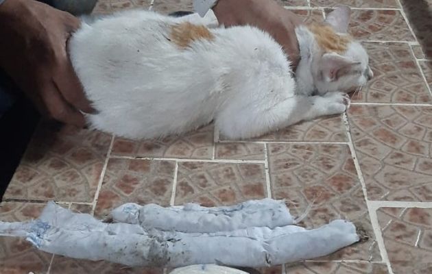 El felino, de color blanco, tenía la supuesta droga amarada con un rollo de tela alrededor de su cuerpo.