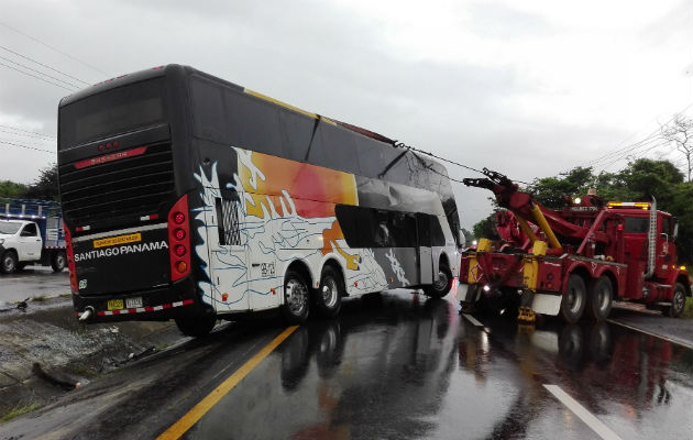 El autobus con matrícula 9B-123 quedó volcado sobre la cuneta central que divide los cuatro carriles de la via Interamericana en este tramo de Panamá Oeste.