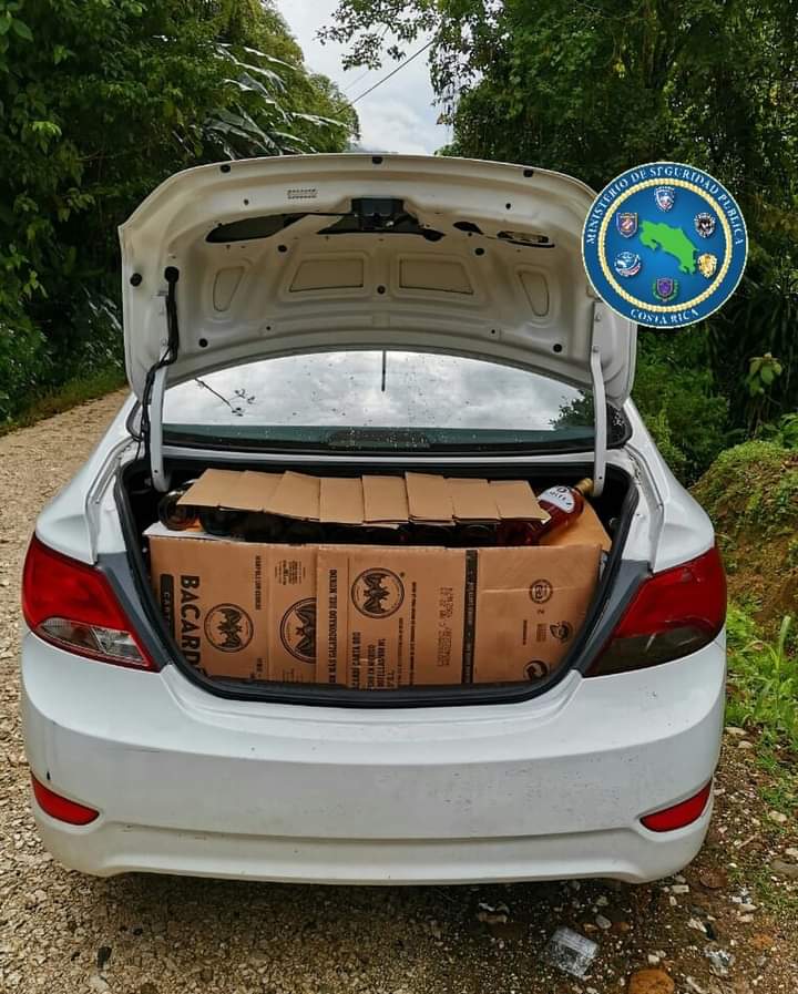 Oficiales de la Fuerza Pública de Costa Rica nuevamente realizan una importante incautación de licor de contrabando a bordo de un vehículo tipo sedan en el sector de San Vito de Coto Brus, cerca a la frontera con Panamá.