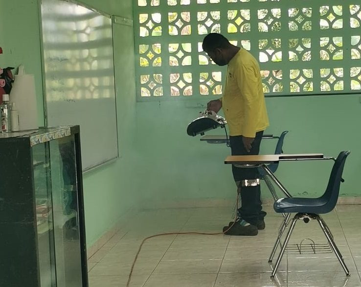 Tareas de desinfección en las escuelas de El Lirio y Santa Cruz. Foto: Eric A. Montenegro