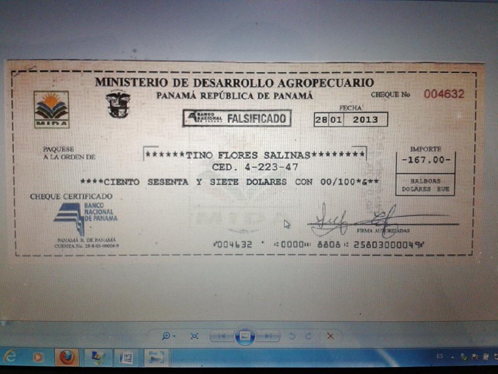 El año pasado se detectaron cheques falsos de una empresa privada y dos instituciones gubernamentales incluyendo el Ministerio de Desarrollo Agropecuario (MIDA).