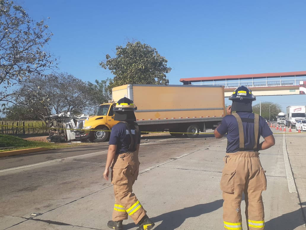 El accidente dejó además unas 14 personas heridas, entre ellas nueve de consideración, luego que el camión impactó al bus, que quedó completamente destruido, a un costado del vía.