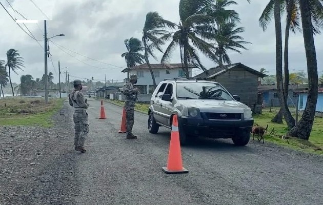 Agentes de la tercera zona Aeronaval mantienen un punto de control en el puesto táctico de Cuango, en el distrito de Santa Isabel, Costa Arriba de Colón.