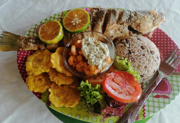 Un plato de comida con la pesca del día en Playa Arrimadero.