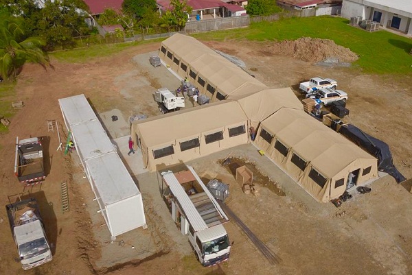 El montaje de la estructura del hospital de campaña que se levanta en los predios de la policlínica Dr. Santiago Barraza de la Caja de Seguro Social (CSS) en La Chorrera, provincia de Panamá Oeste, registra un avance del 85%.