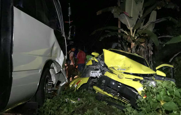 Según los primeros informes, el taxi al tratar de revasar otro vehículo, colisionó de manera frontal con el bus, donde viajaban 30 pasajeros, de los cuales resultaron heridos cuatro personas. VEA TAMBIÉN: ¡Reclamos! Suspenden clases en escuela de El Progreso Se pudo conocer, que el bus tipo Coaster realizaba un viaje especial con un grupo de indígenas que participaban de una reunión en Changuinola, y el taxi quien viajaba desde Almirante, no tomó las precauciones al rebasar un camión, causando el accidente.Los pasajeros se llevaron tremendo susto, algunos testigos dijeron que solo vieron el taxi cuando venía de frente y posteriormente el impacto, donde algunos pasajeros sufrieron heridas leves. VEA TAMBIÉN: Aprehenden a menor de 16 años con droga en Guabalá Tras la colision, el vehículo de transporte selectivo (taxi), este se salió de la vía, quedando en medio de un herbazal y unas plantaciones de plátano, donde no se registraron víctimas en este auto.