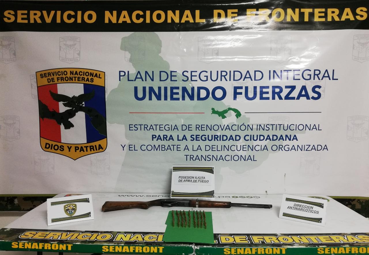 Unidades del Servicio Nacional de Fronteras (Senafront), en la provincia de Chiriquí, detuvieron a dos hombres que portaban un arma de fuego y municiones sin el permiso correspondiente.