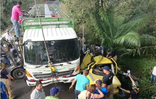 Los ocupantes de taxi quedaron atrapados en la carroceria de donde fueron rescatados por personal del Benemérito Cuerpo de Bomberos de Panamá, regional de La Chorrera.