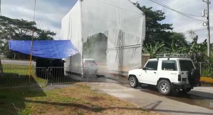 Los vehículos que transitan por la vía interamericana con dirección al distrito de Barú tienen que pasar obligatoriamente por el sistema el cual fumiga con productos los autos para desinfectarlos del virus.