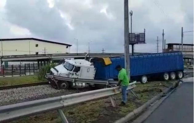Un equipo pesado se fue contra los barandales y quedó a unos centímetros del riel del tren en la Costa Atlántica. El accidente ocurrió a la altura de los Cuatro Altos en el corregimiento de Cristóbal en la provincia de Colón El hecho se registró aproximadamente a las 8:30 de la mañana de este domingo. Se presume que el conductor perdió el control y fue a dar al área donde transita el tren. Unidades del tránsito acudieron a la escena del accidente que no provocó tranque porque era domingo.