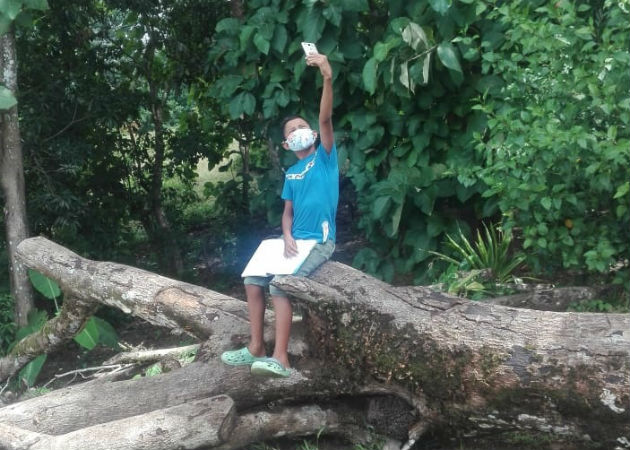 Los niños se montan en las ramas de los árboles para no perder las clases, por lo que piden la intervención de la dirección regional del Ministerio de Educación para que puedan habilitarle la señal de Internet en el centro educativo.