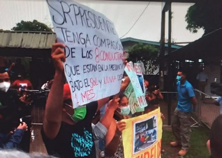 Durante la visita del presidente Cortizo a la comunidad de San Juan, los familiares y amigos de los transportistas encadenados intentaron de acercarse al gobernante panameño con pancartas en mano, para escuchara sus peticiones.