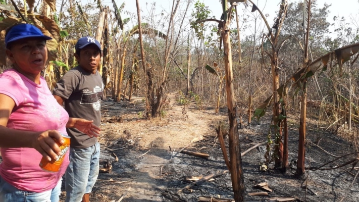 Ruth Vega hermana del difunto Apolonia Vega y el vecino Artura Aguilar, recorren la finca incendiada donde fue encontrado el señor Apolonio. Foto Cortesía/Elena Valdéz