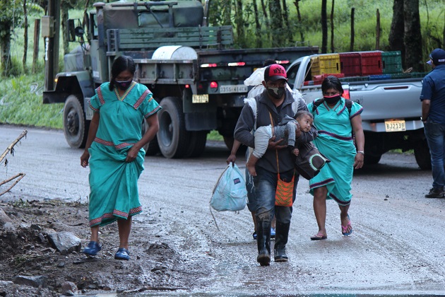 Pobladores afectados por las lluvias e inundaciones tras el paso de Eta, caminan en una carretera del distrito de Tierras Altas, en Chiriquí. Foto: EFE